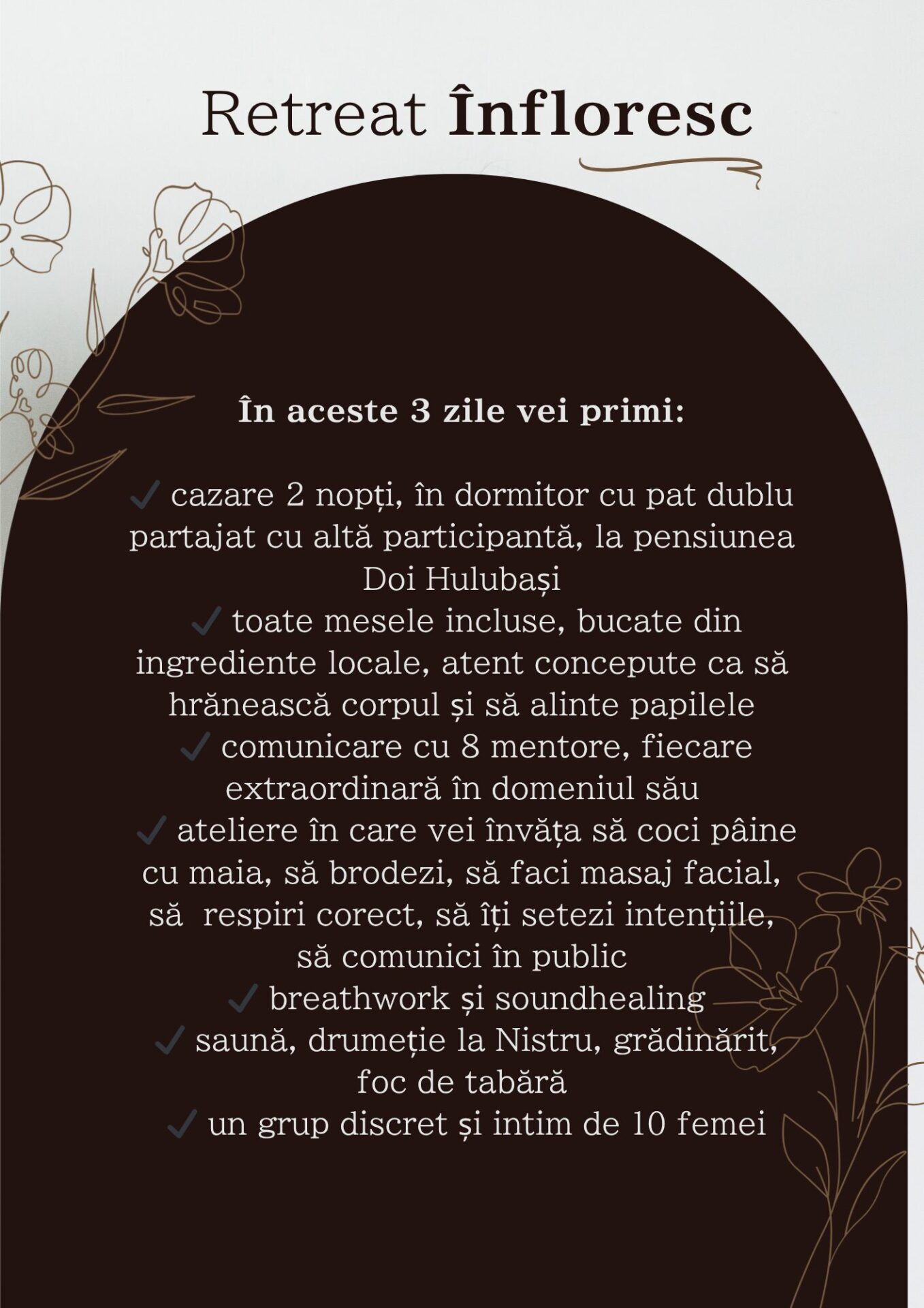 ✔ ateliere în care vei învăța să coci pâine cu maia, să brodezi, să faci masaj facial, să respiri corect, să îți setezi intențiile, să comunici în public
